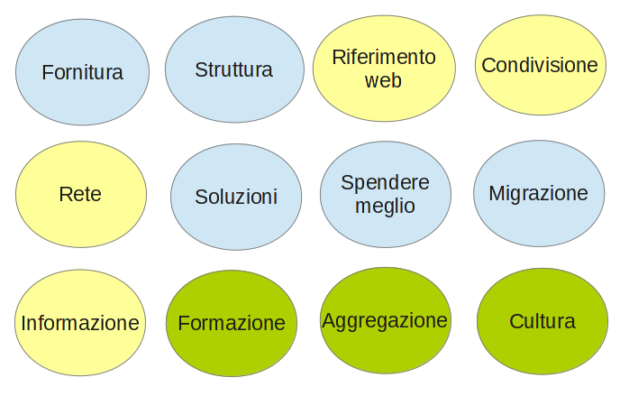 - Cultura: questa area comprende le attività collegate alla sensibilizzazione e formazione sul progetto e sulle opportunità che esso riveste nei vari ambiti. Comprende inoltre la comunicazione per facilitare l'adozione di soluzioni e la condivisione di buone pratiche;